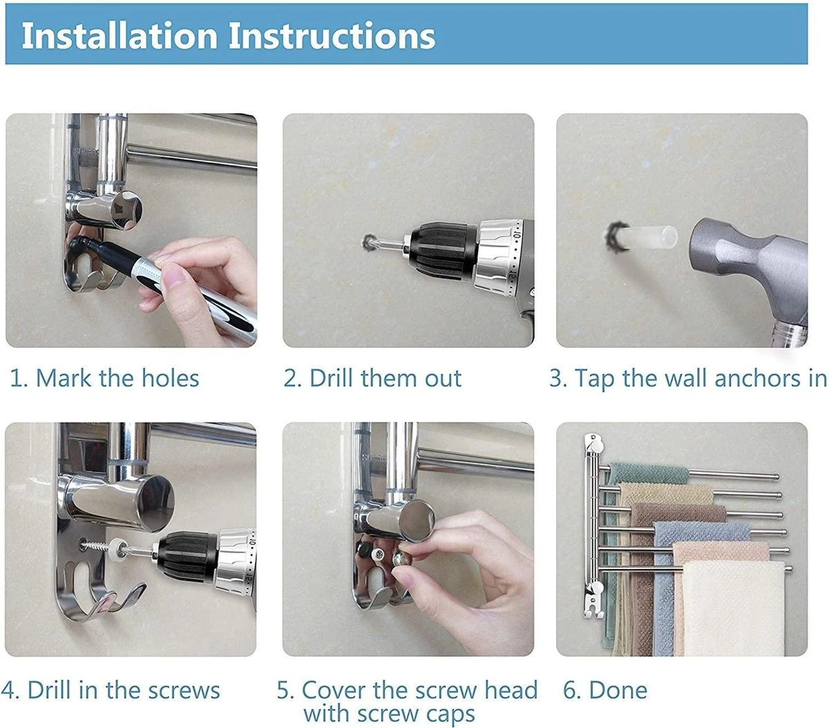 Robuust en duurzaam: de handdoekhouder voor de badkamer is gemaakt van roestvrije materialen en SUS304 roestvrij staal. Deze handdoekhouder is corrosiebestendig, duurzaam en gemakkelijk schoon te maken. RUIMTEBESPAREND: geweldige oplossing voor het organiseren van handdoeken in een kleine ruimte. Met zes stevige armen heb je extra opbergruimte voor handdoeken, washandjes en meer zonder dat je ruimte in beslag neemt. 180° DRAAIEN: Met meerdere zwenkarmen kunt u uw gewenste armen spreiden om ze gemakkelijk te kunnen drogen en naar achteren tegen de muur zwaaien om ruimte te besparen. STIJLVOL ONTWERP: Roestvrijstalen afwerking zorgt voor een stijlvolle en schone uitstraling door weerstand te bieden aan corrosie, krassen en roest. Montage onderdelen zijn inbegrepen. MEER DAN EEN HANDDOEKRAIL – Kan tot 30 lbs bevatten. Kan worden gebruikt in slaapkamer, badkamer, kast en keuken, voegt een praktische functie toe aan je kamer en voegt warmte en stijl toe aan je interieur.