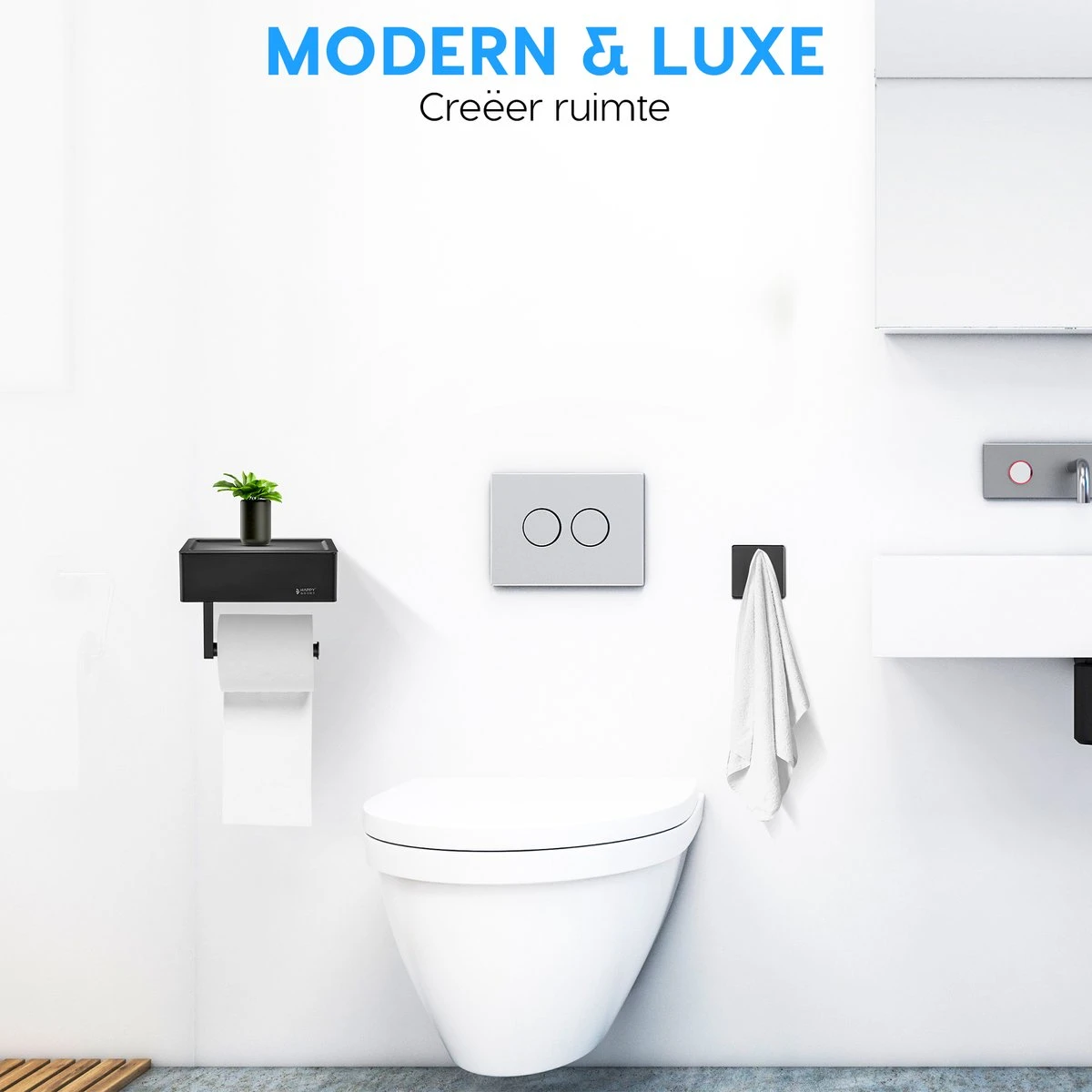 - Verpakking inhoud: 1x wc rolhouder zwart, 1x bakje met plankje, 1x Power Sticker, 1x Set Schroeven, 1x Installatiehandleiding