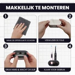 Je kunt de tandenborstelhouder gemakkelijk ophangen aan de muur. Gebruik hiervoor wel een gladde ondergrond, zodat de tandenborstelhouder goed blijft hangen. Je hoeft niet te boren in je muur, zo heb je ook geen lelijke gaten in je muur. Met de meegeleverde plakstrip kun je de tandenborstelhouder eenvoudig ophangen.