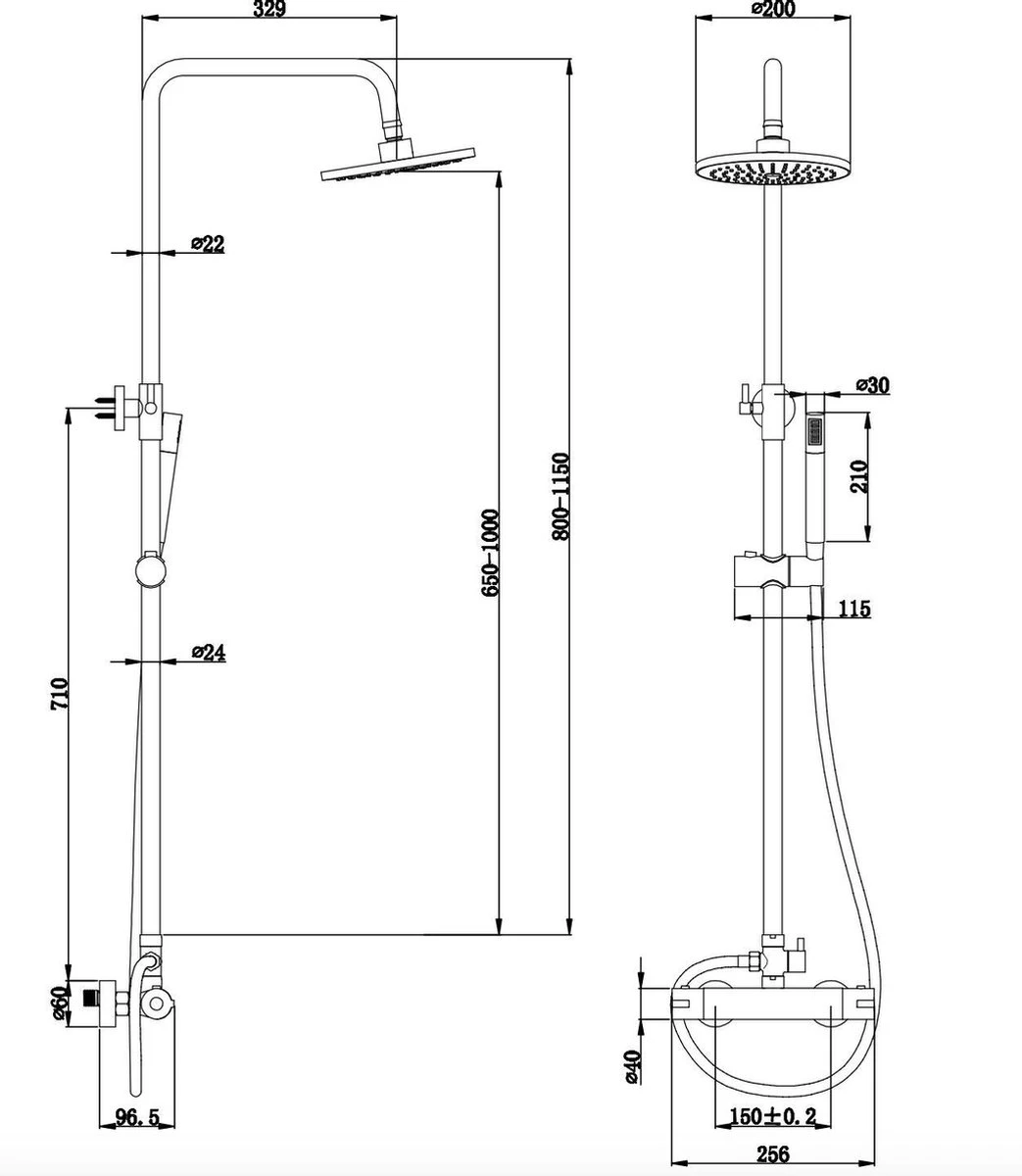 - Hoogte regendouche: 800-1150 mm (in hoogte verstelbaar)