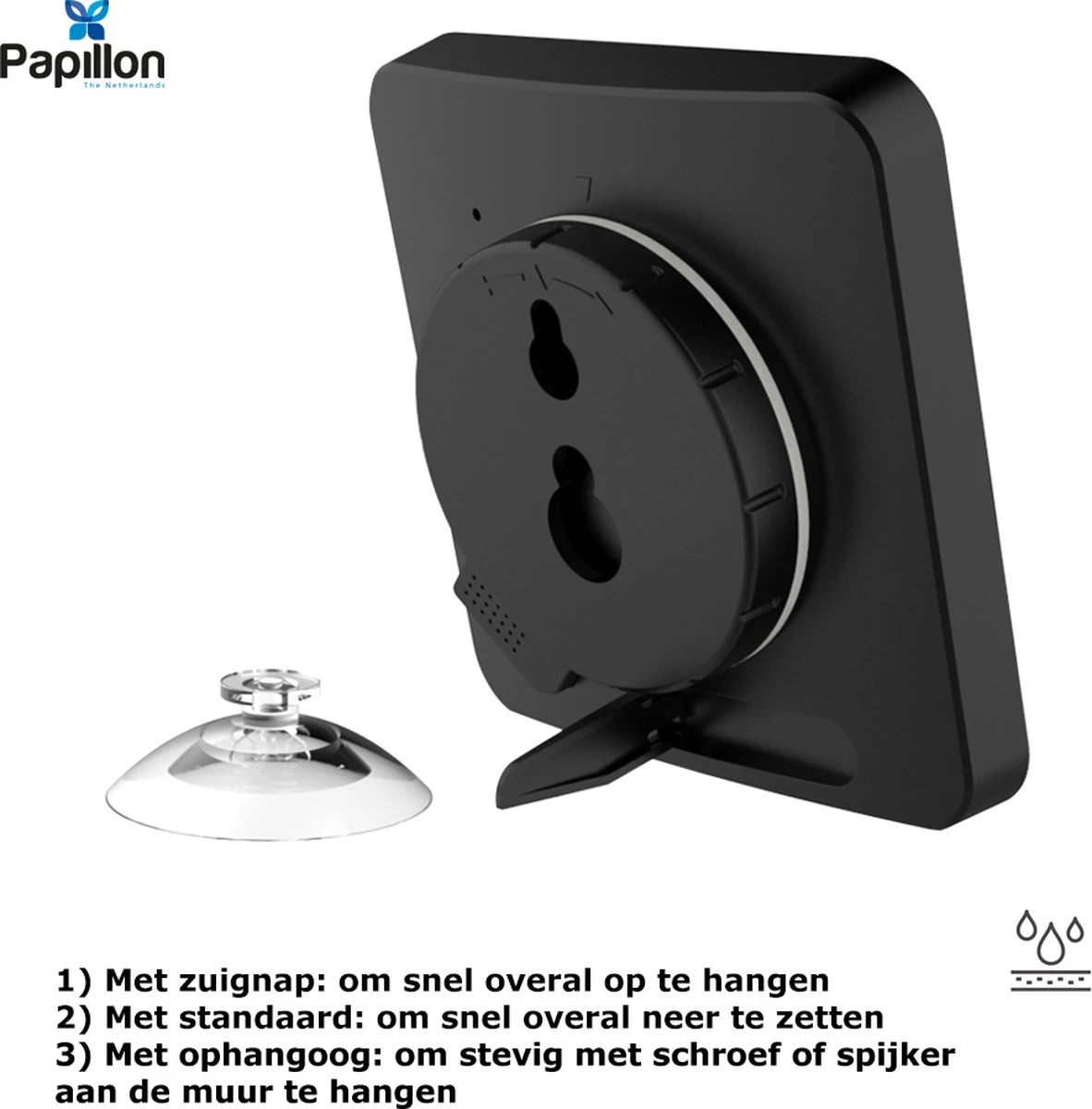 Met 1 simpele druk op de tiptoetsen stel je de timer in. Ook geeft deze zwarte douchetimer (met grote zuignap) automatisch de temperatuur en vochtigheidsgraad aan.