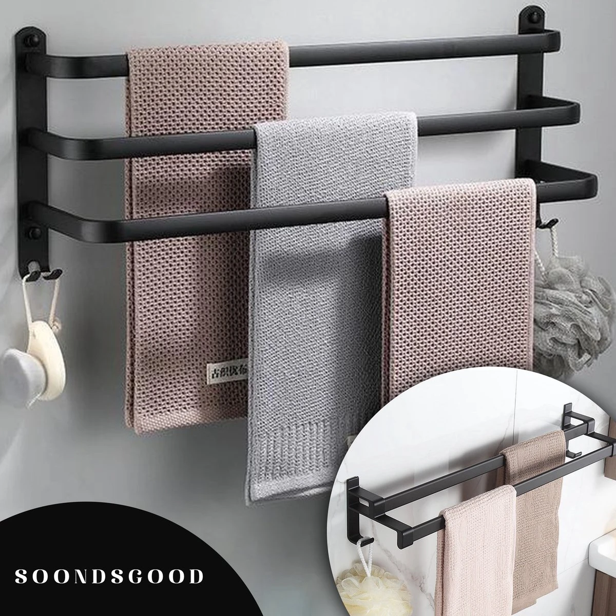 Dit handdoekrek is de trend van het moment! Met dit rek breng je die gave industriele look in huis die we kennen van o.a. de stalen deuren. Het handdoekrek is van het merk Soondsgood dit merk staat voor kwaliteit en luxe. De hernieuwde 2021 collectie voldoet aan alle eisen en is supermakkelijk te installeren met lijm of bijgeleverde schroeven. De stijlvolle armen bieden plaats aan meerdere handdoeken en geven een optimale invulling aan de ruimte rondom de wastafel. Het 3-armige handdoekrek is daarnaast eenvoudig te bevestigen en de bevestigingsmaterialen zijn amper zichtbaar. Bestel vandaag het handdoekrek van Soondsgood Dit rek wordt vaker aangeboden via bol maar dit is de meest voordelige!