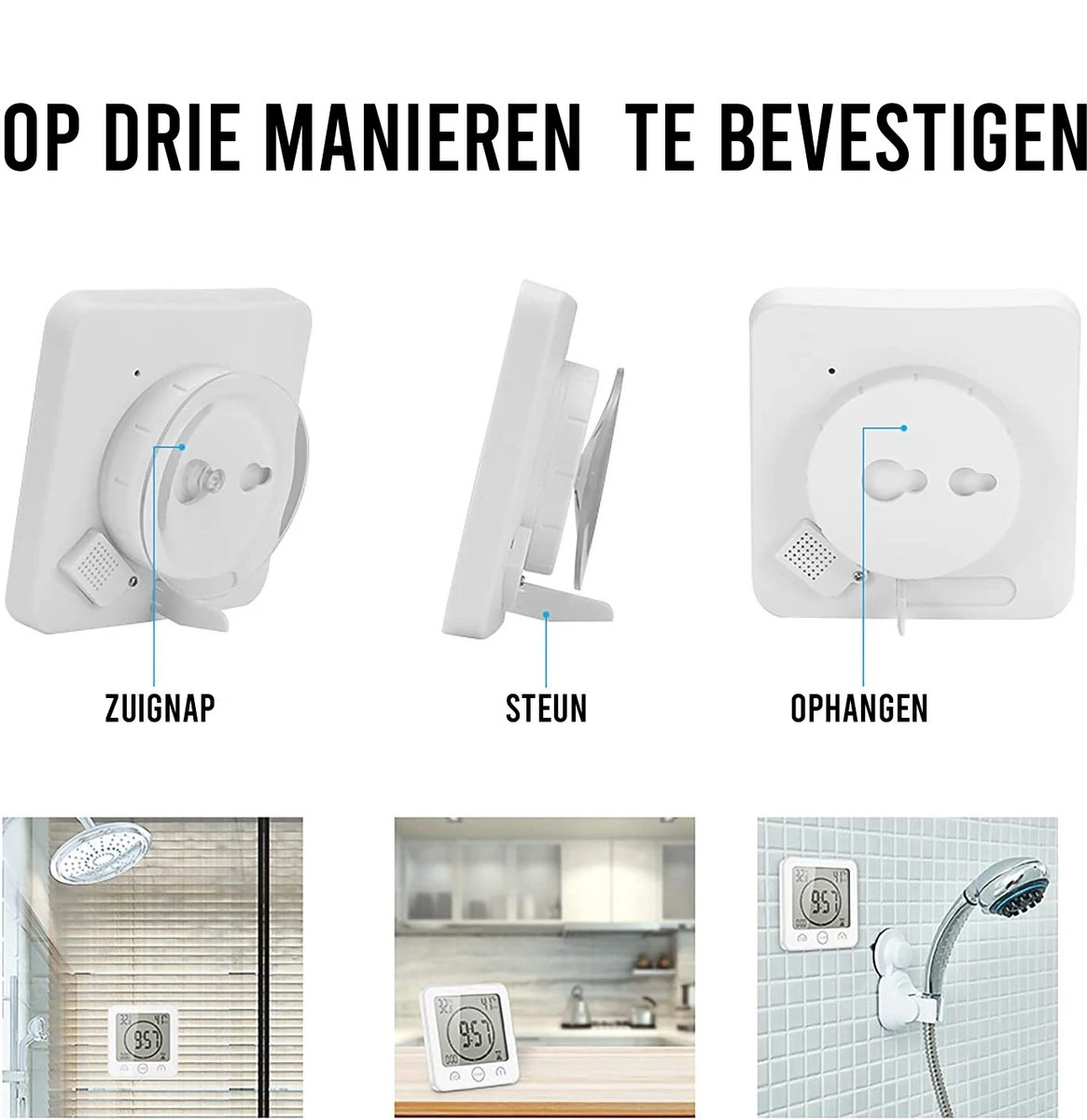 De douchetimer heeft een aftelklokfunctie (totaal 99 minuten). Je kunt de doucheklok op drie manieren bevestigen: hangend, staand of met de zuignap. Let erop dat het oppervlak schoon en droog moet zijn als je de zuignap wil gebruiken. Ideaal voor op een raam, spiegel of op graniet. Hang de showertimer niet direct onder de douche. De klok is alleen beschermd tegen opspattend water.