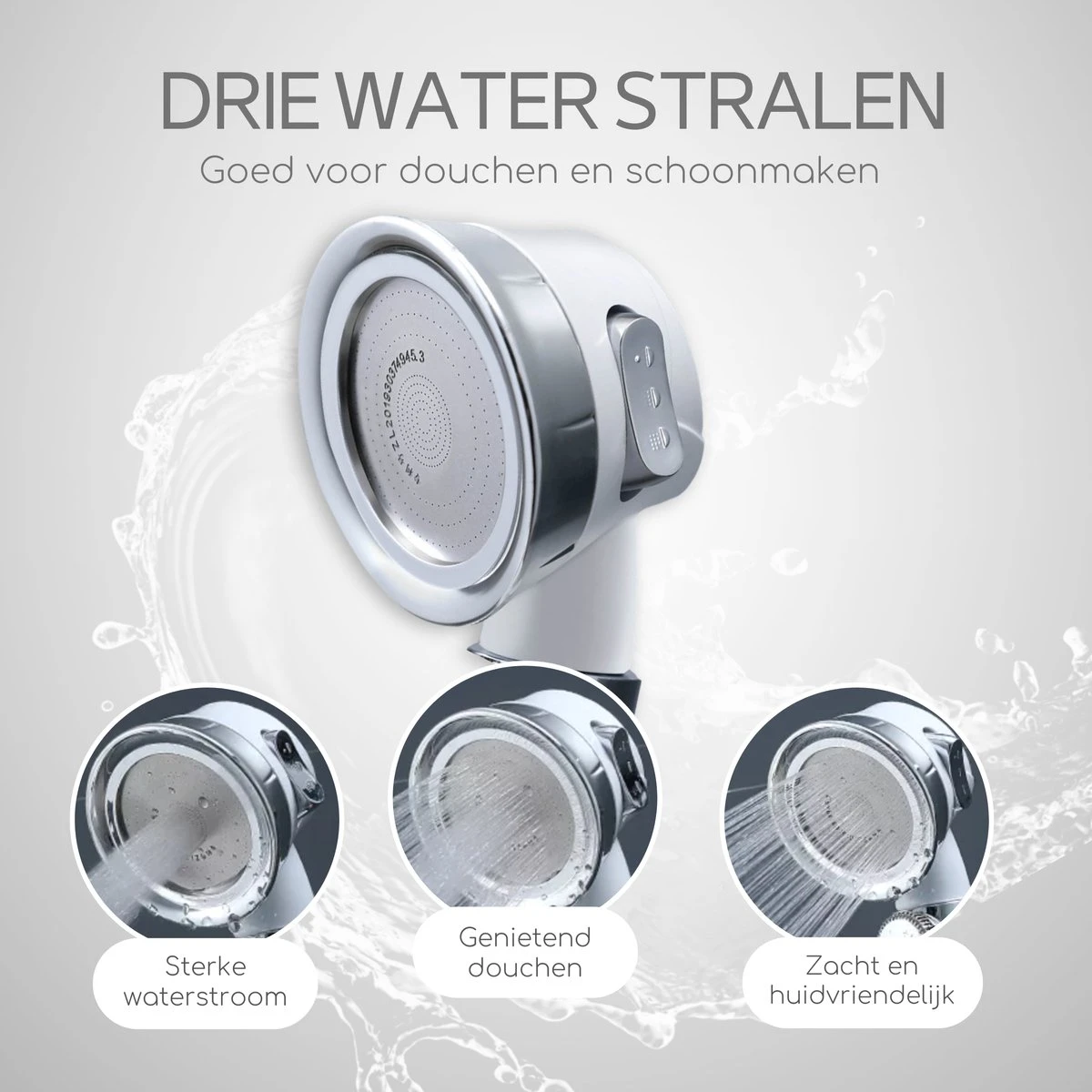 Je kan het water van de douche laten stoppen, door eenvoudig op te middelste stop-knop te drukken. Zodra je op de stop-knop drukt, zal de klep van de douchekop sluiten en zal er geen overbodig water meer uitdruppelen. Tevens is de kracht van het water moeiteloos te controleren door simpelweg te draaien naar de gewenste hoeveelheid water. Zo heb je altijd de correcte hoeveelheid water op je lichaam zonder dat je met gesloten ogen in het rond aan het zwaaien bent.