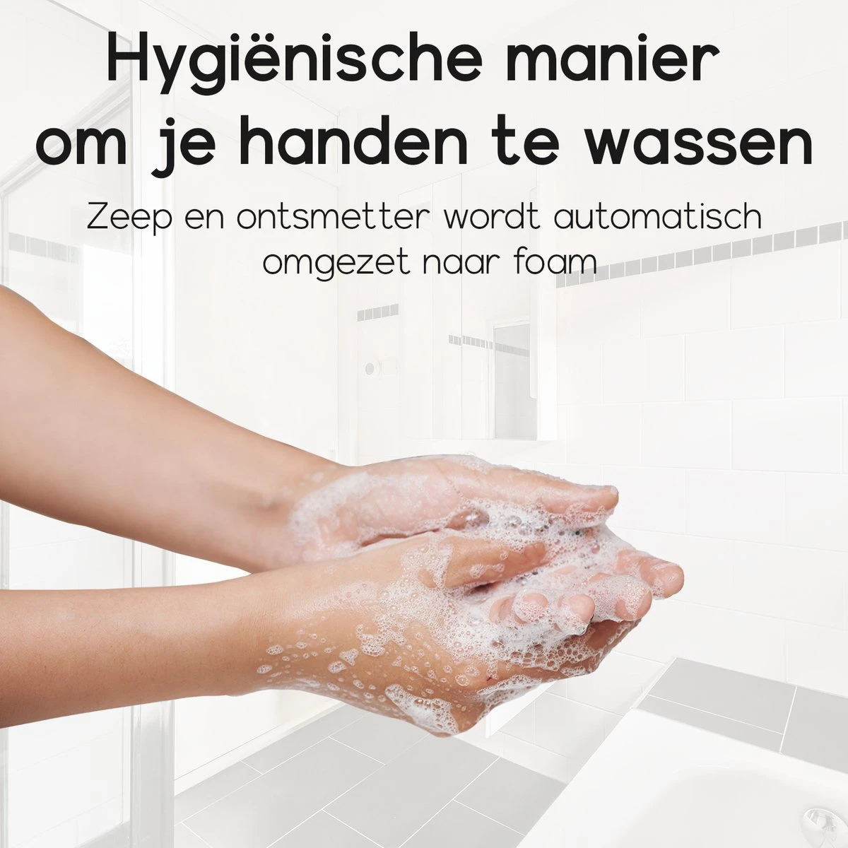 - Automatisch foam – De zeepdispenser zet zeep en ontsmetter automatisch naar een reinigende foam om. Deze foam voelt zacht aan op de huid en reinigt ook de kleine poriën in de handen voor extra efficiënte reiniging.