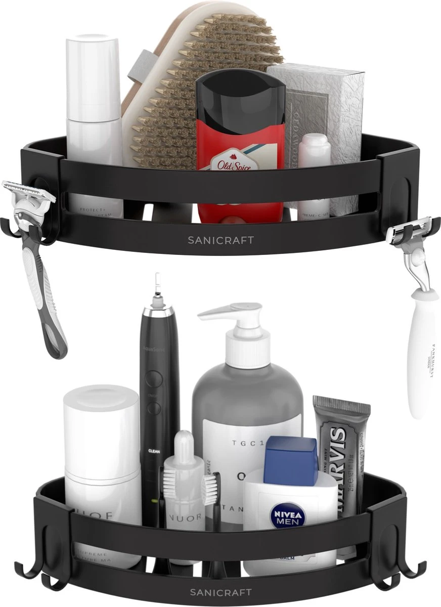Het tweedelige doucherekje is groot genoeg voor alle douchespullen van jou en je partner, of zelfs het hele gezin. Dankzij de speciale haken zijn rondslingerende scheermesjes en sponzen voorgoed verleden tijd.