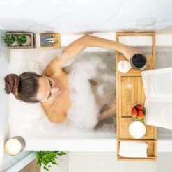 ➡️ De ultieme accessoire voor luxe en ontspanning! Creëer uw eigen spa-moment en geniet (alleen óf samen) van een warm bad met kaarslicht, ontspannende muziek, een goed boek en een heerlijk glas wijn. Het bamboe badrekje van Swilix heeft een fijn design met natuurlijke look. Het rekje is te plaatsen op het bad en zorgt ervoor dat je tijdens het badderen je meest favoriete spullen binnen handbereik hebt. Alles is stabiel en veilig neer te zetten op het badrekje. Op deze manier is het nog meer ontspannen tijdens het nemen van een bad.