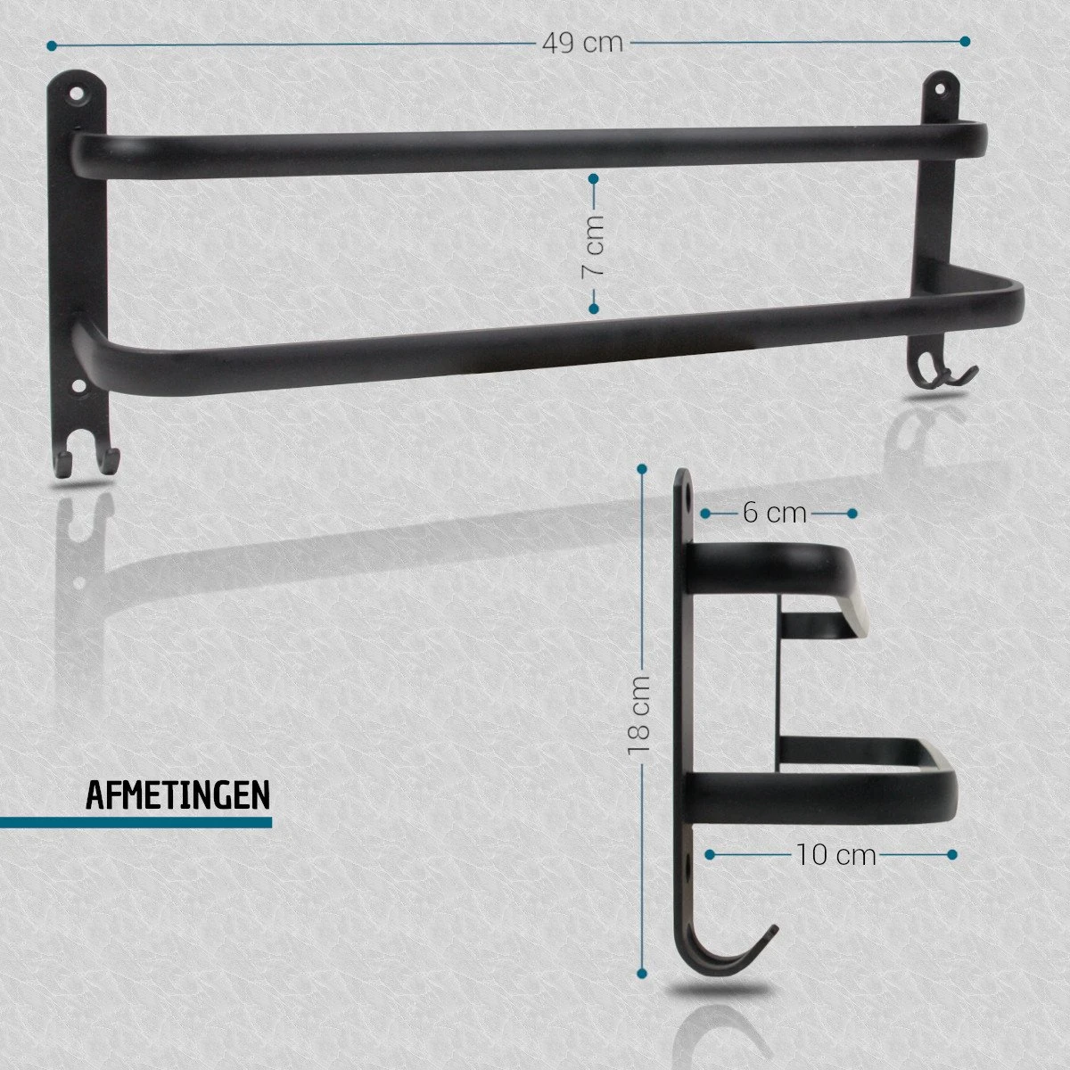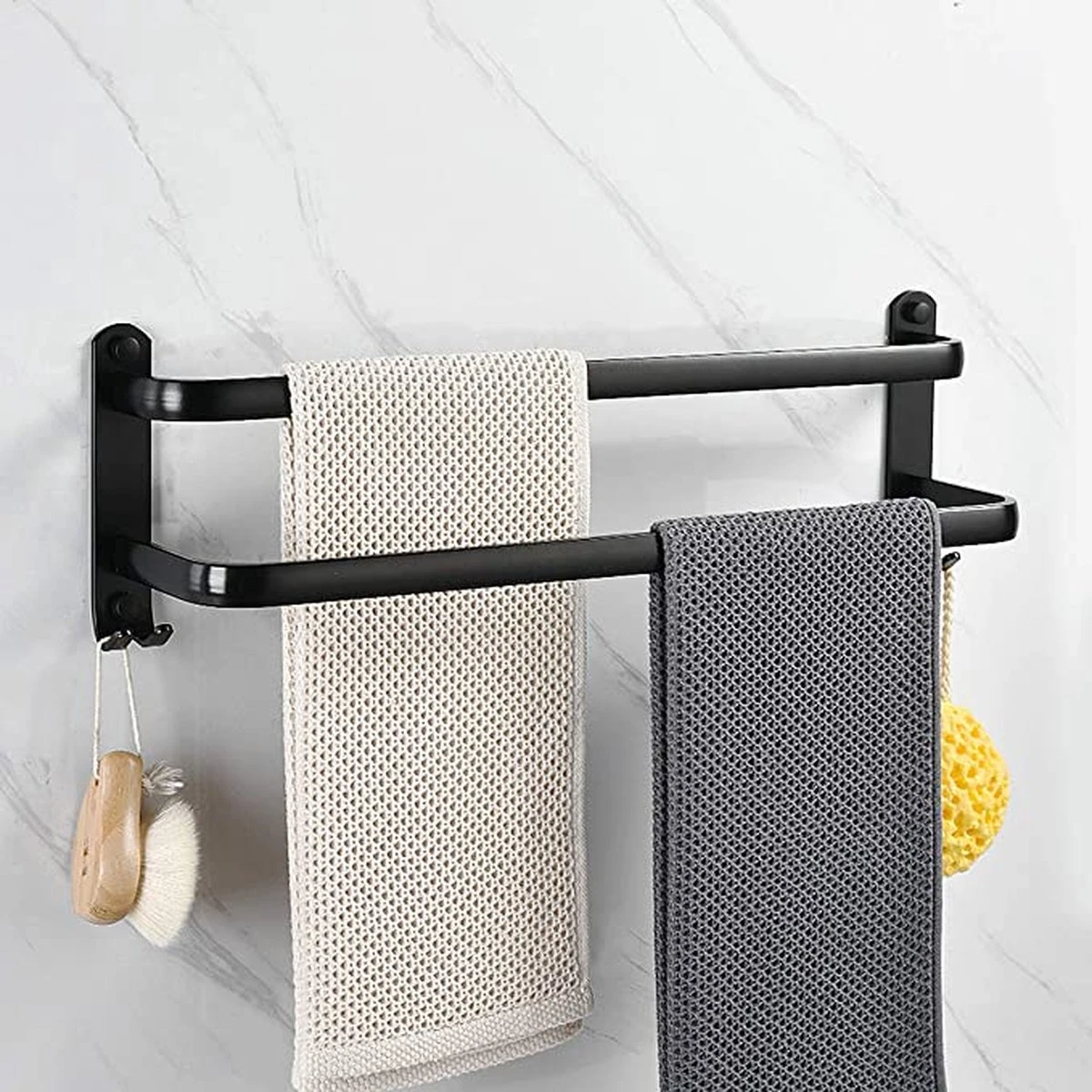 De twee stangen hebben voldoende tussenruimte zodat de natte handddoeken niet tegen elkaar aan hangen en ze goed kunnen drogen.