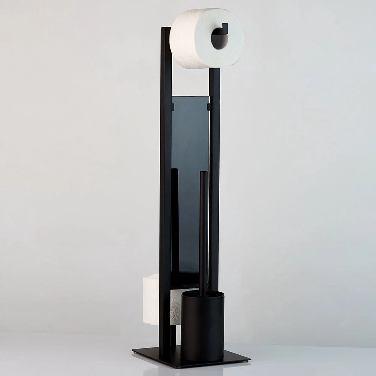 De hoogwaardige staande toiletbutler Rivalta is gemaakt van zwart gelakt staal gecombineerd met zwart, gehard glas.
